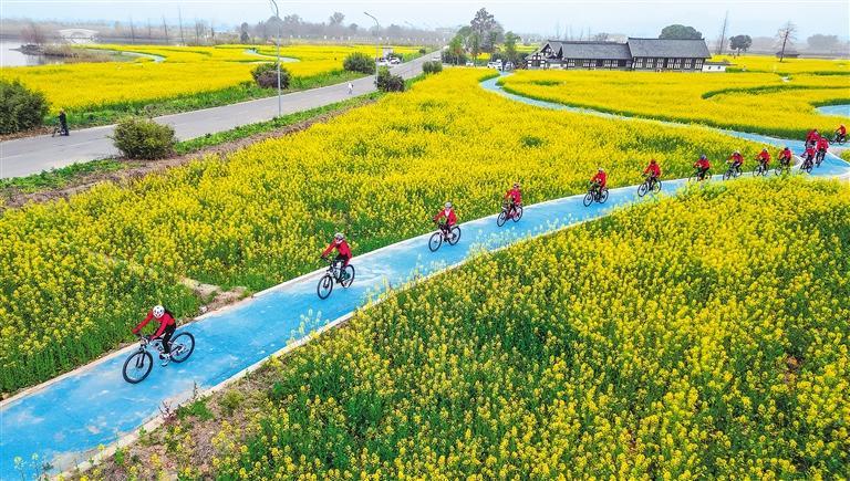 2月20日,骑行爱好者在四川省眉山市彭山区“五湖四海”湿地公园绿道骑行赏花。近日,该湿地公园上千亩油菜花盛开,吸引众多骑行爱好者前来领略春色,享受运动快乐。近年来,当地坚持生态优先、绿色发展理念,打造花田景观,为市民休闲、健身、游玩提供良好的公共空间,同时助推文旅产业发展。翁光建摄(中经视觉)