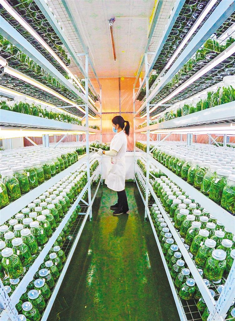 ◀2月18日,贵州省从江县贯洞镇铁皮石斛育苗基地,员工在精心检查铁皮石斛苗长势。卢忠南摄