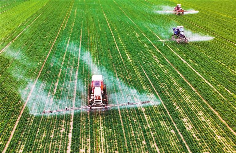 ▼2月18日,安徽省利辛县纪王场乡孙老家村,村民驾驶自走式高杆喷雾机对小麦进行喷洒作业。刘勤利摄