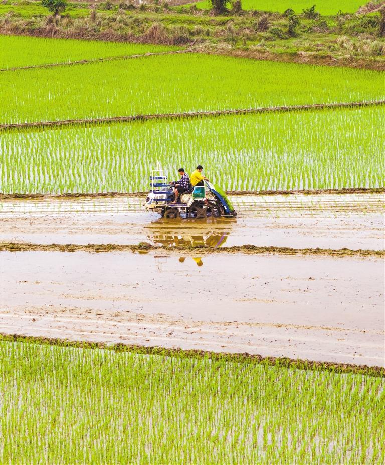 ◀2月15日,海南省海口市云龙镇坡仑村稻田,村民使用插秧机忙插秧。