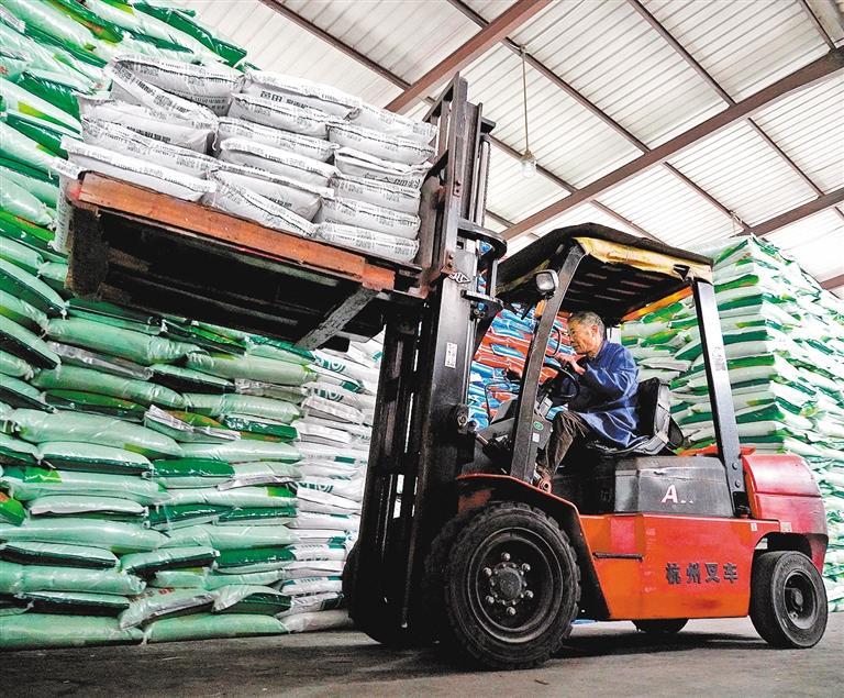 ▶2月20日,浙江省乐清市供销农资企业,员工在搬运外销的农资。