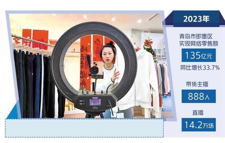 “2023年,即墨区实现网络零售额135亿元,同比增长33.7%,带货主播888人,直播14.2万场,观看29亿人次,带货主播数及直播场次稳居青岛市首位。同时,青岛市直播电商数字经济产业园也获评国家级电子商务示范基地。”即墨区商务局党组成员周桥安说。