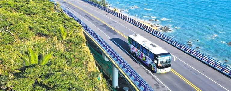 2月21日,观光巴士行驶在海南环岛旅游公路万宁正门岭大桥路段。