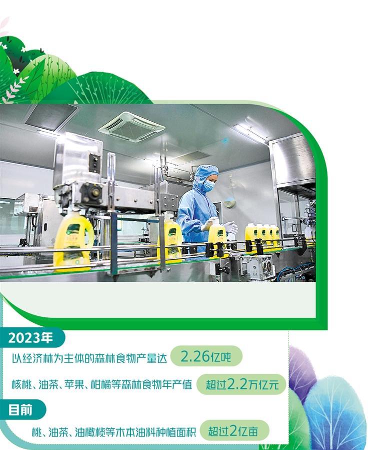 国家林业和草原局统计显示,2023年,以经济林为主体的森林食物产量达2.26亿吨。森林食物已成为我国继粮食、蔬菜之后的第三大重要农产品。