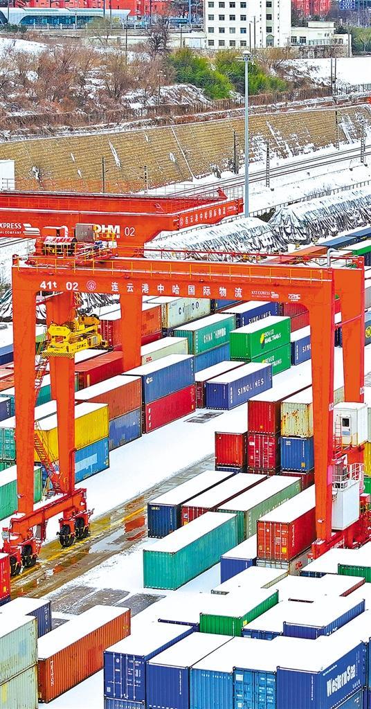 2月22日,江苏省中哈连云港物流合作基地,大型机械正吊装集装箱。王健民摄