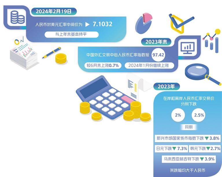 数据显示,2023年末,中国外汇交易中心人民币汇率指数报97.42,较6月末上涨0.7%;2024年1月份继续上涨1.5%。