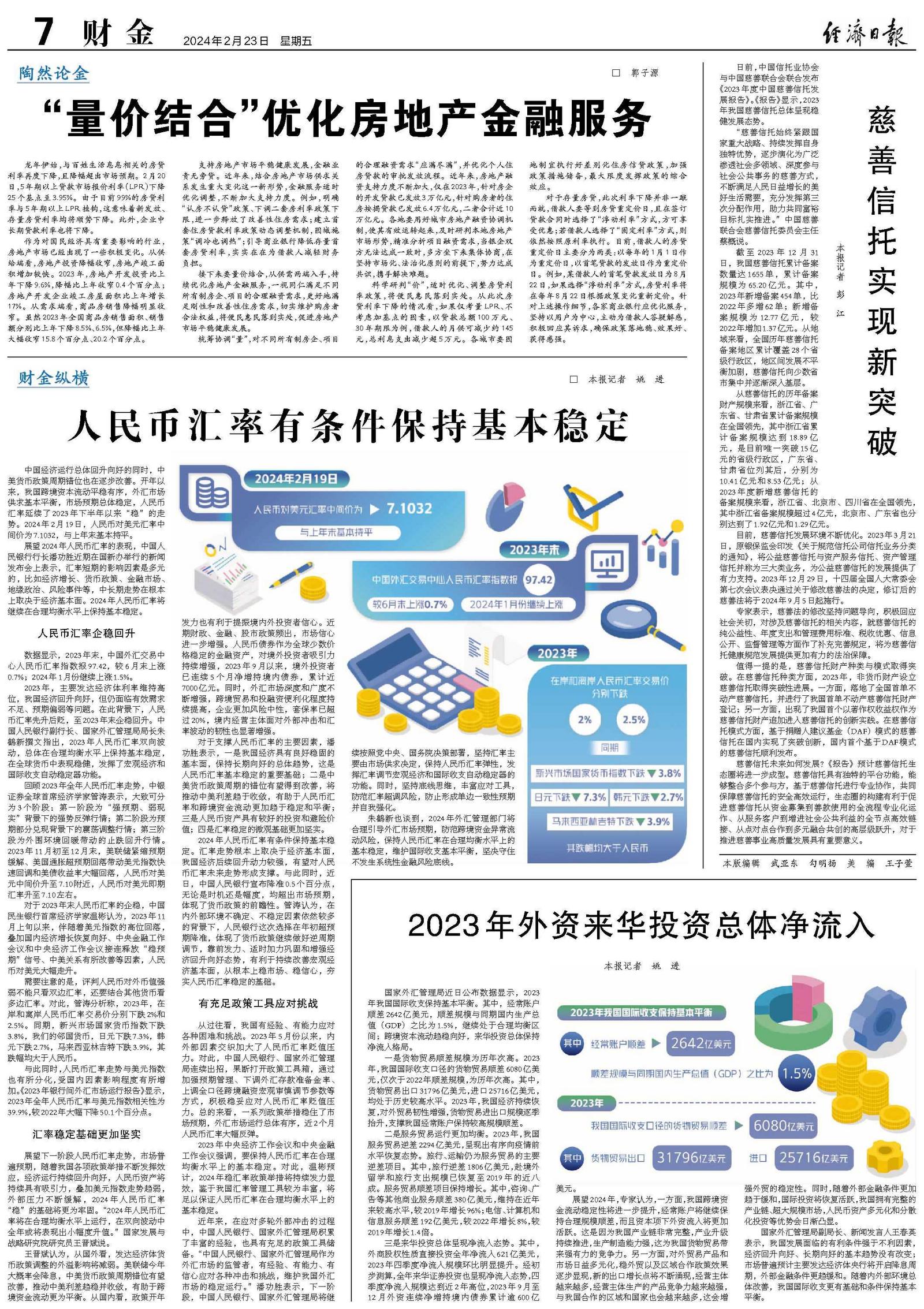 2023年中央经济工作会议和中央金融工作会议强调,要保持人民币汇率在合理均衡水平上的基本稳定。对此,温彬预计,2024年稳汇率政策举措将持续发力显效,鉴于我国汇率管理工具较为丰富,将足以保证人民币汇率在合理均衡水平上的基本稳定。