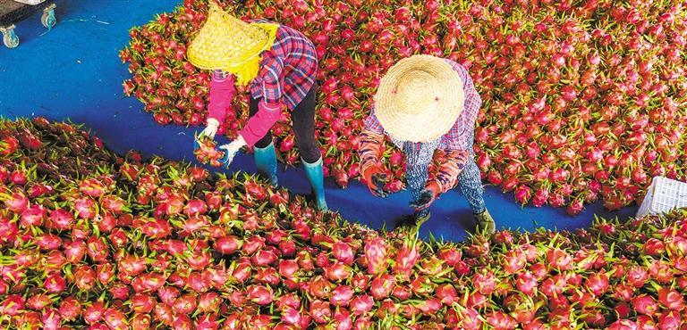 ▲厦门翔安区大宅社区火龙果丰收。通过生态治理,这里已建成福建省最大的火龙果连片种植基地。