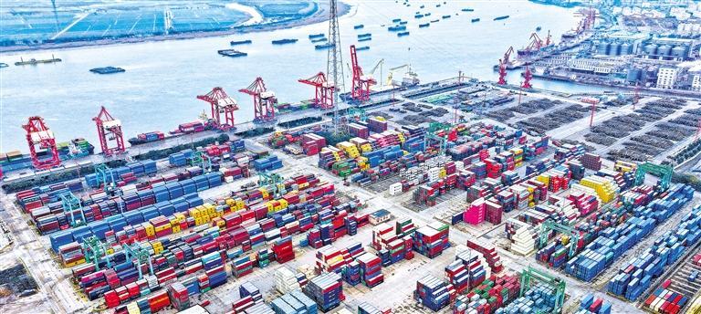 2月22日,在长江张家港段水域江面上,装载生产生活物资的船舶在江面上往返穿梭,码头上货物装卸有序。当前正值企业复工和春耕备耕时节,民生物资需求大增,长江作为重要的交通大动脉,呈现出一派繁忙运输景象。施柏荣摄(中经视觉)