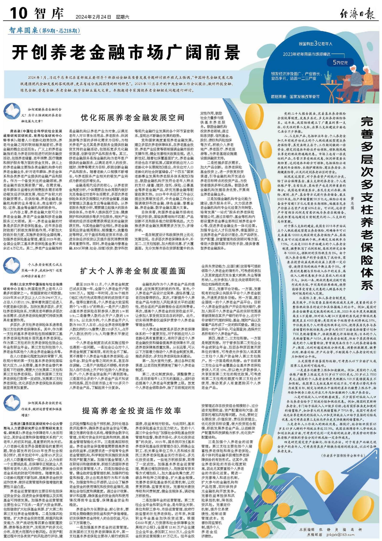 房连泉(中国社会科学院社会发展战略研究院研究员、世界社保研究中心秘书长):随着人口老龄化趋势加快,养老与金融之间的联结越来越密切,养老金融的概念应运而生。广义上的养老金融指的是为养老目标而进行的财务融资活动,包括养老储蓄、老年消费、医疗健康和照护服务等方面的资金支持。狭义上的养老金融主要指各类金融机构参与的养老金融业务,针对老年群体、养老金体系和各类养老产业提供的金融产品和服务。作为一个备受关注的金融领域,养老金融市场发展前景广阔。在需求端,老年群体日益增长的消费服务需求将带动银发经济快速发展,相应产生较大的投融资需求。在供给端,养老金融是金融机构新的业务增长点,商业银行、保险、证券、基金等金融机构积极参与。