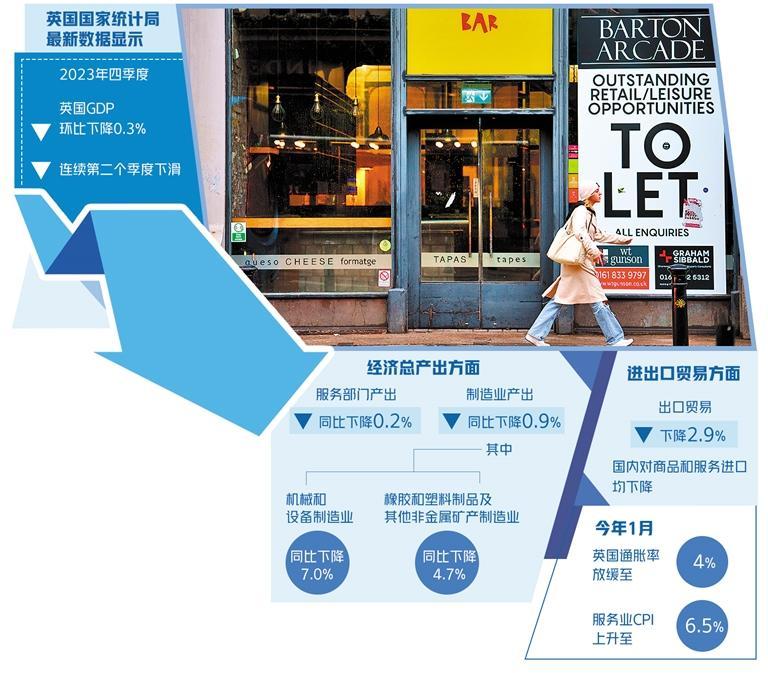 近日,英国国家统计局公布最新经济数据显示,2023年四季度,英国国内生产总值(GDP)环比下降0.3%,为连续第二个季度下滑。尽管英国政府没有对“衰退”进行官方定义,但连续2个季度的负增长已被经济学家视为“技术性衰退”。据英国国家统计局测算,2023年英国GDP仅增长0.1%,除去受疫情影响的2020年,这是自2009年以来最糟糕的经济增长表现。数据还显示,英国人均GDP连续7个季度萎缩,是自1955年有官方经济数据记录以来最糟糕的表现。