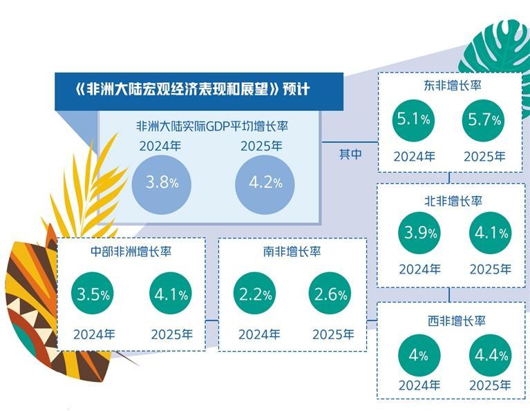报告指出,尽管受到诸多不利因素影响,非洲大陆经济体仍然保持韧性,预计非洲大陆5个地区将实现正增长。其中,东非得益于改善内部互联互通和深化区域内贸易的战略投资增长,将继续引领非洲增长势头,预计2024年和2025年的GDP增长率分别上升至5.1%和5.7%;北非受持续恶劣气候条件和宏观经济挑战影响,预计2024年增长率稳定在3.9%,2025年将略增长至4.1%;中部非洲预计2024年增长率将放缓至3.5%,但个人消费的复苏以及矿业投资和出口的增加或将助推其2025年增长率升至4.1%;南非预计2024年和2025年的增长率分别维持在2.2%和2.6%的低迷水平;西非预计2024年和2025年增长率将分别升至4%和4.4%,尽管尼日利亚和加纳的经济增速有所放缓,但该地区大多数国家经济强劲增长将抵消该影响。此外,布基纳法索、马里和尼日尔宣布退出西非国家经济共同体加大了该地区经济增长的不确定性。