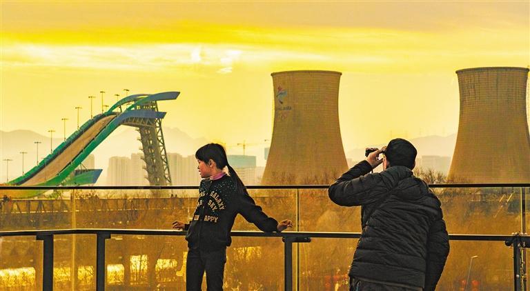 ▼游客在首钢园赏景。经过改造修建,首钢园内山水风光交融共生,景观步道交错延伸,一幅奥运元素与工业遗存、历史沉淀与自然景观相融合的画卷铺展在眼前。