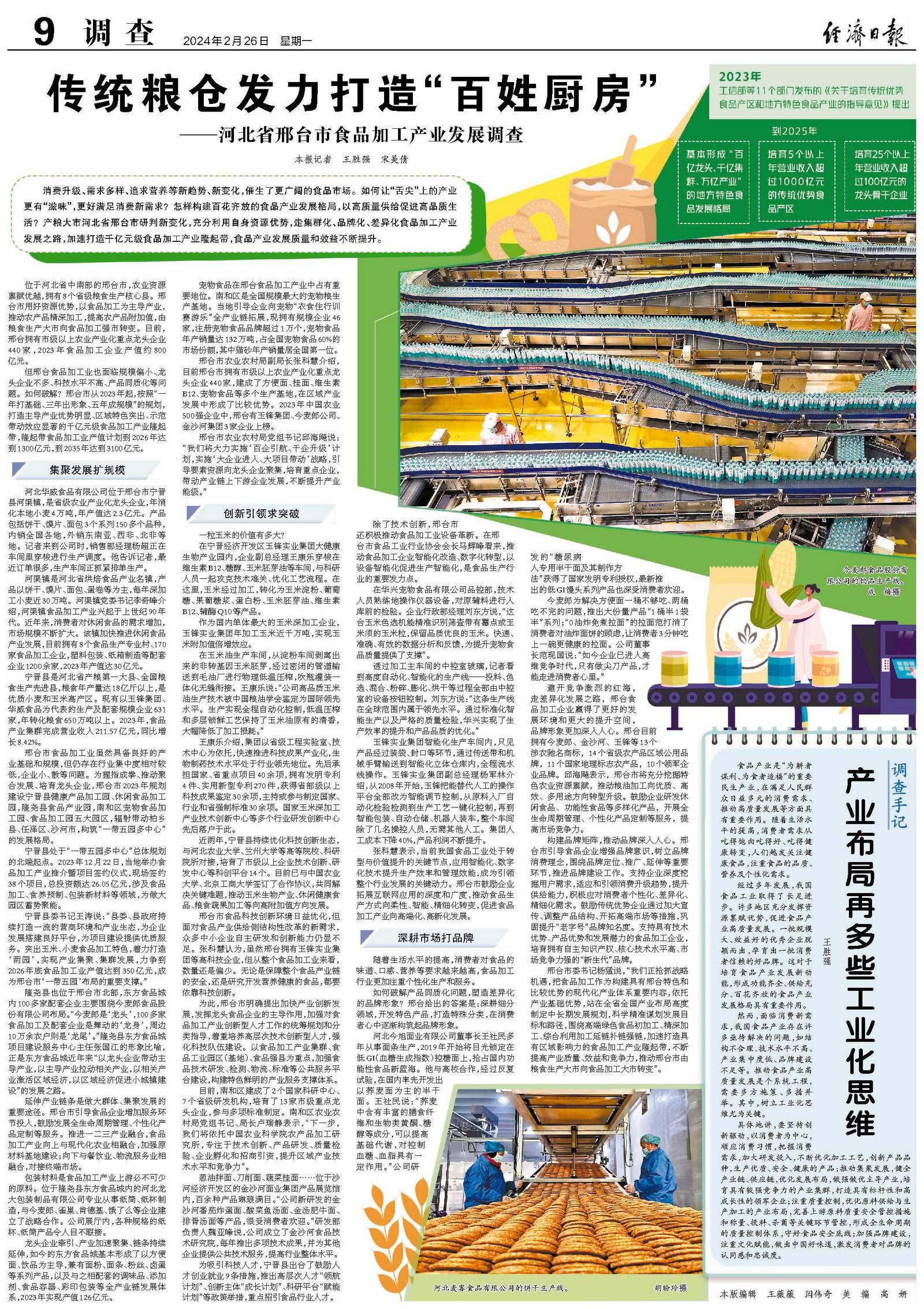 位于河北省中南部的邢台市,农业资源禀赋优越,拥有8个省级粮食生产核心县。邢台市用好资源优势,以食品加工为主导产业,推动农产品精深加工,提高农产品附加值,由粮食生产大市向食品加工强市转变。目前,邢台拥有市级以上农业产业化重点龙头企业440家,2023年食品加工企业产值约800亿元。