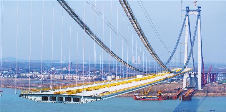 2月26日,建设中的龙潭长江大桥。该桥北接江苏扬州仪征市,南接南京市、镇江句容市,目前已进入钢箱梁吊装施工阶段,预计今年3月底吊装完成。
