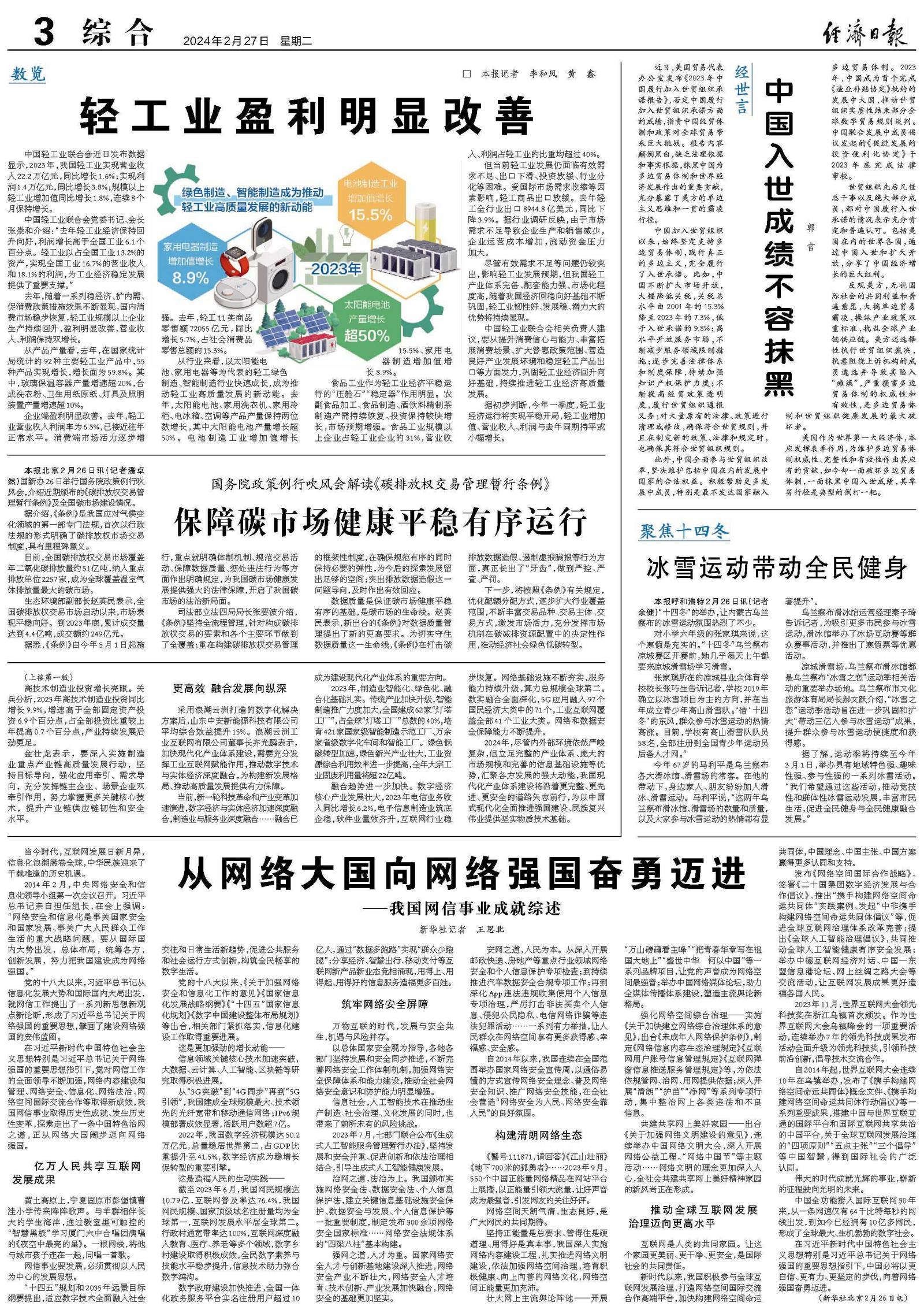 C919大型客机投入商业运营,国产首艘大型邮轮“爱达·魔都号”正式命名交付,16兆瓦海上风电机组并网发电,智能6行采棉机实现量产……2023年,我国产业体系更加完整。