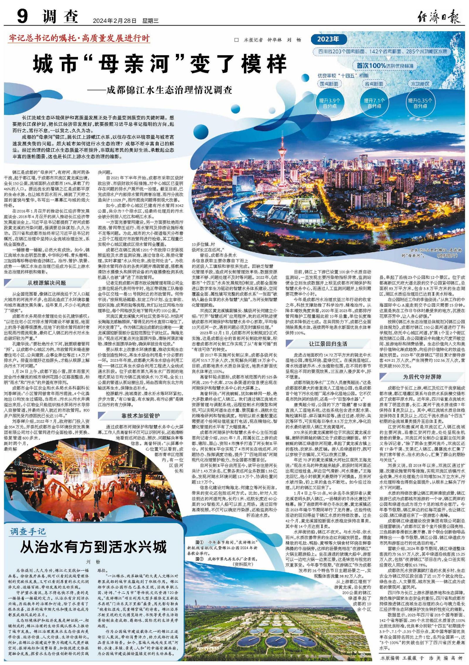 四川作为长江上游水源涵养地和生态屏障,肩负维护国家生态安全的重任,四川省和成都市持续推进锦江流域生态治理的决心与魄力是长江经济带生态环境保护发生转折性变化的缩影。