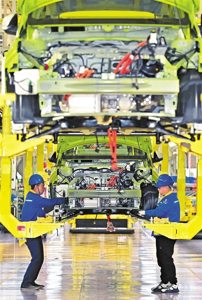 2月27日,江西省一家新能源汽车企业车间内,工人正在流水线上作业。去年以来,江西省加快推动电动载人汽车、太阳能电池、锂电池这外贸“新三样”发展,去年全年出口同比增长73.5%。李 劼摄(中经视觉)