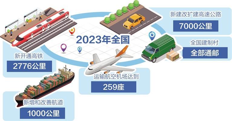 交通运输部部长李小鹏介绍,2023年新开通高铁2776公里,新建改扩建高速公路7000公里,新增和改善航道1000公里,运输航空机场达到259座,全国建制村全部通邮。《交通强国建设纲要》印发5年来,累计完成交通固定资产投资超过18万亿元,综合交通网络总里程超过600万公里。构建了由发展战略、中长期规划、五年规划、五年行动计划等构成的规划计划体系,为做好交通强国建设的各项工作制定了蓝图,推动了落实。