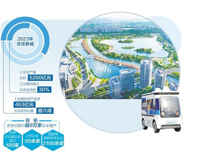 作为北京市高精尖产业发展的主阵地,亦庄已发展成为汇聚全球创新要素的国际化产业舞台,吸引超9万家企业落户,其中世界500强企业超过100家、上市企业50余家、国家级高新技术企业2100余家;2023年贡献了北京近30%的工业增加值,战略性新兴产业占比达44%。