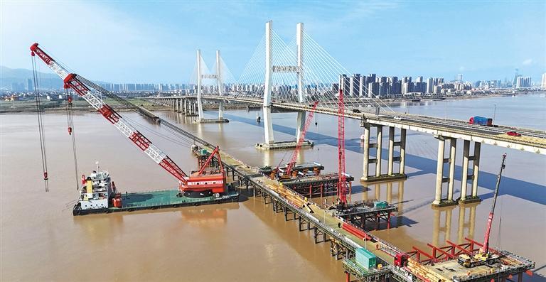 3月2日,甬台温高速公路温州大桥扩建工程建设现场,工人们正进行桩基施工。该项目建设工期48个月,全线总体采用八车道高速公路标准改扩建,设计速度100公里/小时。蔡宽元摄(中经视觉)