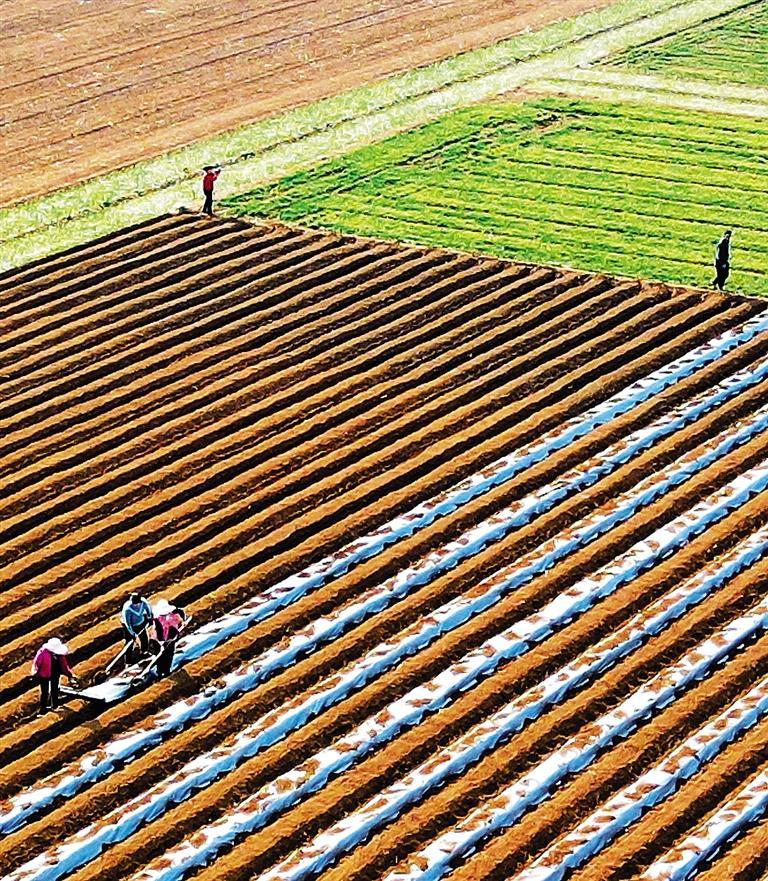 当下正值春耕备耕的农忙时节,山东省临沂市平邑县地方镇农民在田间为种植的马铃薯覆盖地膜。武纪全摄(中经视觉)