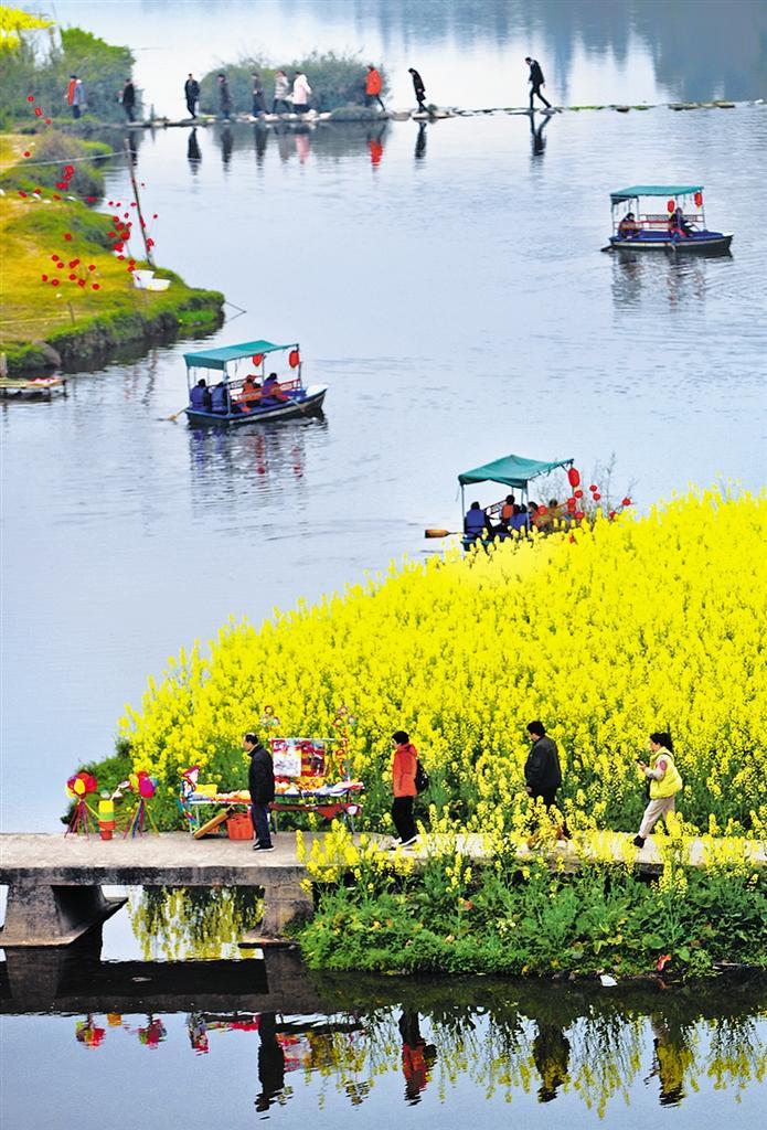 三月三日,四川省宜宾市江安县阳春镇大中坝村,游客在油菜花海游玩。当地万亩油菜花迎来盛开期,一天最多接待游客近三万人次。兰 锋摄(中经视觉)