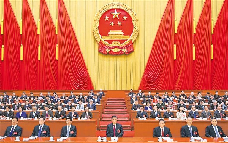 人民大会堂大礼堂气氛隆重热烈,主席台帷幕正中的国徽在鲜艳的红旗映衬下熠熠生辉。