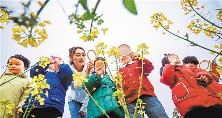⑤2月26日,四川眉山市彭山区五湖四海湿地公园,小朋友在观察春花。