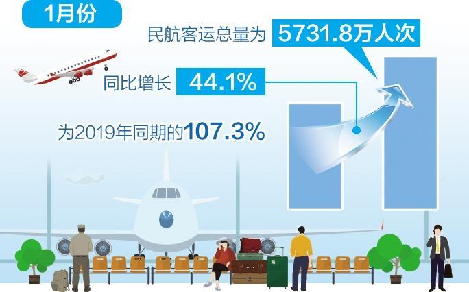 记者日前从中国民航局获悉,2024年1月份,我国民航旅客运输量明显提升。数据显示,1月份,民航客运总量为5731.8万人次,同比增长44.1%,为2019年同期的107.3%。