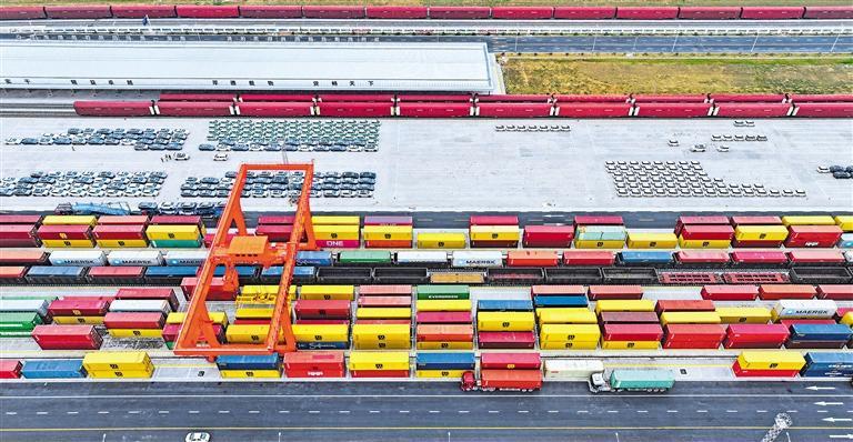 3月9日,安徽合肥派河港铁路物流基地,龙门吊起重机在调运集装箱货柜,作业车辆往来穿梭,现场一派繁忙。