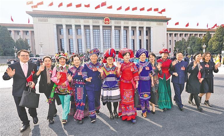 3月11日,第十四届全国人民代表大会第二次会议在北京人民大会堂举行闭幕会。这是闭幕会后,部分代表走出人民大会堂合影留念。