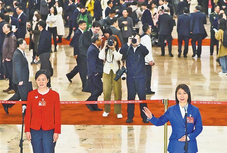 ▲3月8日,十四届全国人大二次会议第二场“代表通道”在北京人民大会堂举行。全国人大代表韩凤香(右)回答记者提问。