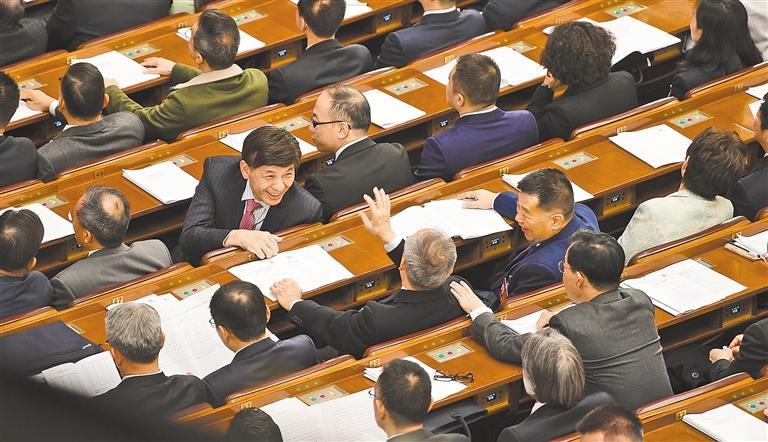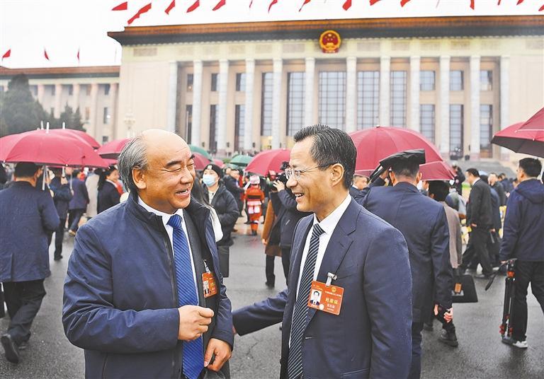 ▲3月5日,全国人大代表梁金辉(左一)与同团代表张志强进行交流。