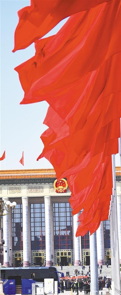 ▶3月11日,北京天安门广场红旗迎风飘扬。