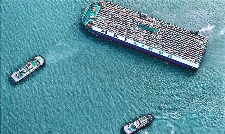 三月十一日,满载着出口汽车的运输船驶离山东港口烟台港。当日,中国汽车工业协会发布的数据显示,前两个月,我国汽车出口八十二点二万辆,增长百分之三十点五。唐 克摄(中经视觉)