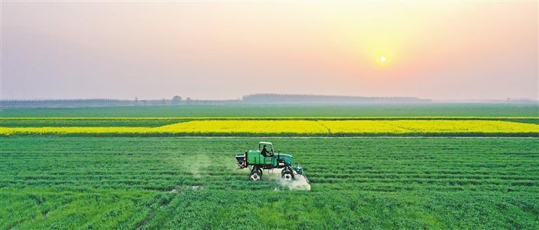 3月12日,安徽省安庆市宿松县复兴镇麦田里,农机手驾驶植保机械为小麦喷药。近年来,安徽农垦华阳河农场创新农业经营方式,助力粮食增产、农民增收。李 龙摄(中经视觉)