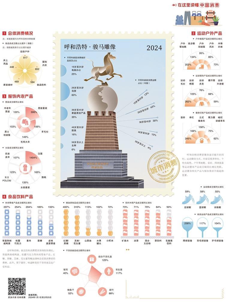借助“十四冬”赛事东风,呼和浩特不断完善冰雪场馆建设,马鬃山滑雪场、东河冰雪场成为区内外游客冰雪旅游的新场所。与此同时,户外运动产品销售持续增长。今年以来,呼和浩特消费者购买了大量户外雪地靴、户外羽绒服等冰雪运动相关产品。此外,网球、羽毛球、乒乓球等运动装备成交额同比增长了258%、117%、104%。