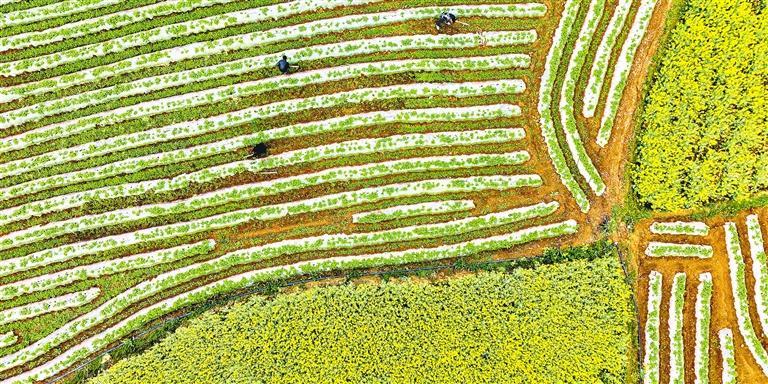 3月18日,农民在贵州省黔西市雨朵镇蒿枝村田间管护土豆苗。