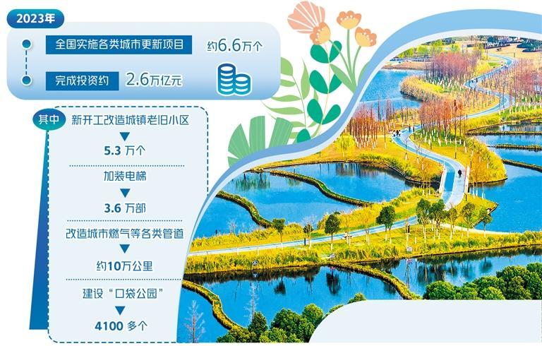 建设和改造好民生工程,是城市更新的重要着力点。《政府工作报告》提出,推动解决老旧小区加装电梯、停车等难题,加强无障碍、适老化设施建设。倪虹介绍,2024年将再改造5万个老旧小区,建设一批完整社区。2023年,全国实施各类城市更新项目约6.6万个、完成投资约2.6万亿元。