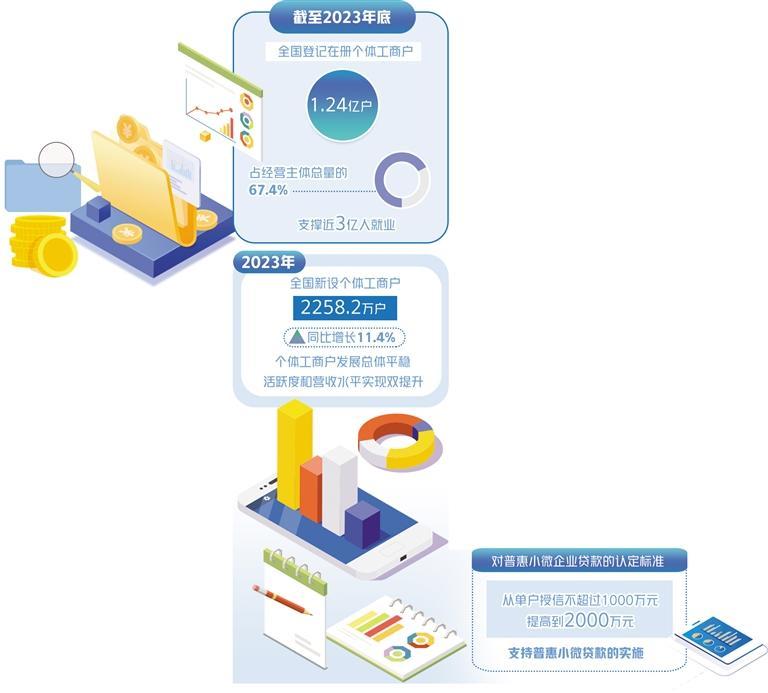 日前,国家市场监督管理总局登记注册局局长任端平在国新办新闻发布会上表示,截至2023年底,全国登记在册个体工商户1.24亿户,占经营主体总量的67.4%,支撑了近3亿人就业。