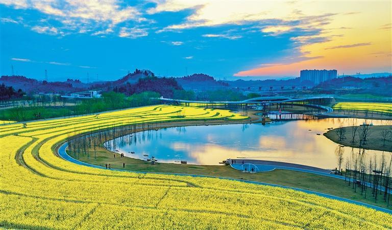 3月18日,湖北省宜昌市卷桥河湿地公园油菜花盛开。该公园每年都会种上时令农作物,打造田景相融的都市农业景观,让市民在城市里也能感受乡村野趣。