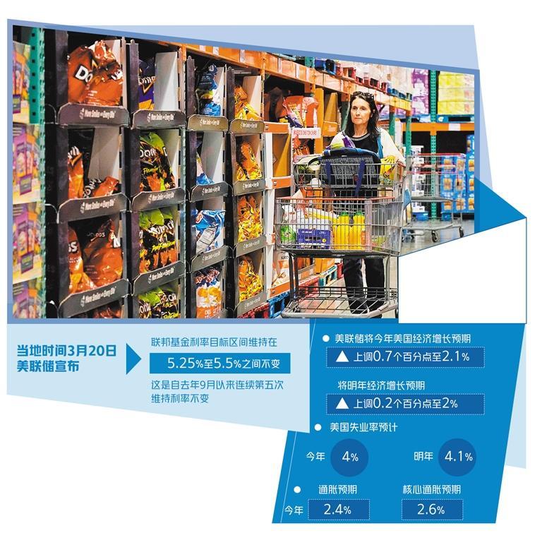 当地时间3月20日,美联储在结束为期两天的货币政策会议后宣布,将联邦基金利率目标区间维持在5.25%至5.5%之间不变,符合市场预期。这是美联储自去年9月以来连续第五次维持利率不变。