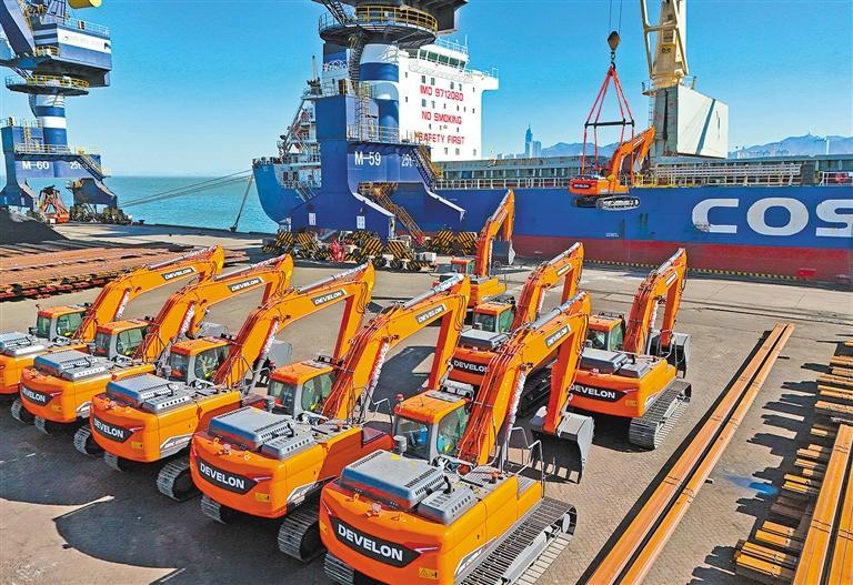 近日,在山东港口烟台港,出口巴西的挖掘机正装入“烟台—巴西”件杂货班轮准备出海。烟台港件杂货国际航线目前已增至23条,成为中国北方件杂货物流枢纽港。