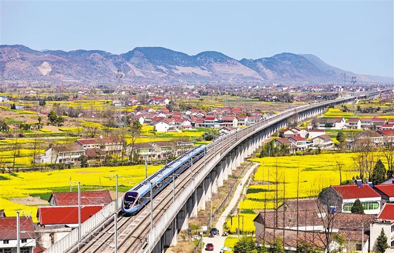 三月二十一日,陕西省汉中市南郑区岳家岭村,一列动车在油菜花海中飞驰。为方便游客踏青赏花,西安至汉中每日往返开行一百三十八趟动车,平均每八分钟一趟,实现两地“公交化”。曹 欣摄(中经视觉)