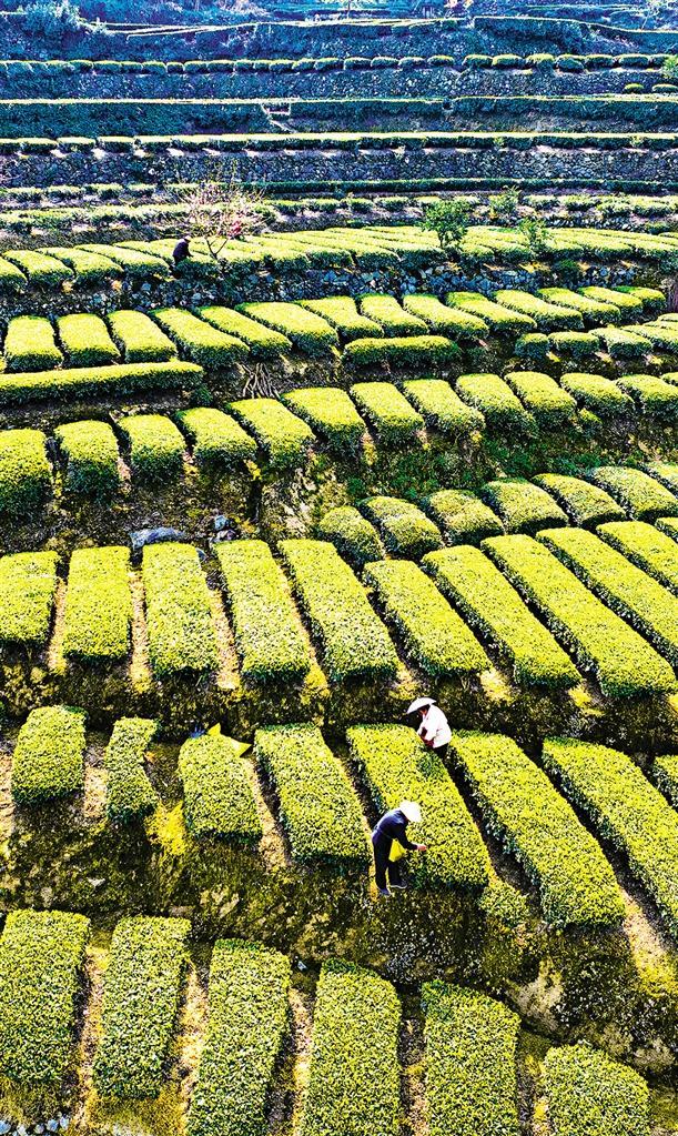3月22日,湖北省宜昌市秭归县,茶农正在茶园采茶。春分刚过,当地早茶进入采摘期,茶农抢抓晴好天气,采摘新茶供应市场。