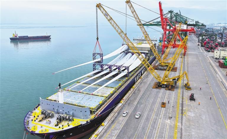 3月22日,福建省福州港江阴港区,全球量产最长108米大功率风电叶片正依次装载上船,准备运往新加坡。近年来,位于福清江阴港城经济区的三峡海上风电国际产业园集聚多家风电龙头企业,形成结构件、电机、叶片、整机等完整产业链,助力海上风电装备制造加快发展。