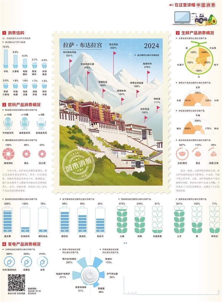 政策持续为消费市场的回升提供了动力。拉萨出台一揽子促消费政策,进一步释放了消费潜力。去年,围绕节庆契机,拉萨组织16个专场促进消费活动,投入专项资金1.18亿元,拉动消费16.8亿元。同时,线上消费成交额大幅增长,细分品类需求更加多样。榨汁机、电陶炉、饭菜保温板等厨房小家电产品受到人们喜爱,手持麦克风、微单镜头等数码产品成交额同比增长较高。