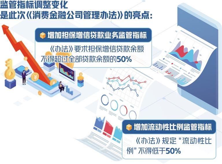 监管指标的调整变化是此次《办法》的亮点之一,主要表现为两方面:一是增加担保增信贷款业务监管指标。鉴于部分消费金融公司高度依赖融资担保公司、保险公司风险兜底,不利于提升自主风控能力,而且间接抬高贷款综合利费水平,《办法》要求担保增信贷款余额不得超过全部贷款余额的50%。二是增加流动性比例监管指标。结合消费金融公司经营特征和风险特点,在审慎测算基础上,《办法》规定“流动性比例”不得低于50%。