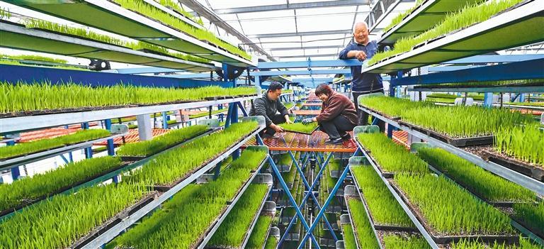 3月24日,在河南省信阳市光山县罗陈乡张楼村青龙河合作社育秧工厂,农民在进行水稻秧苗管护。近年来,当地引进全自动智能化育秧技术,将水稻育秧从室外搬进室内,助力春耕生产提质加速。
